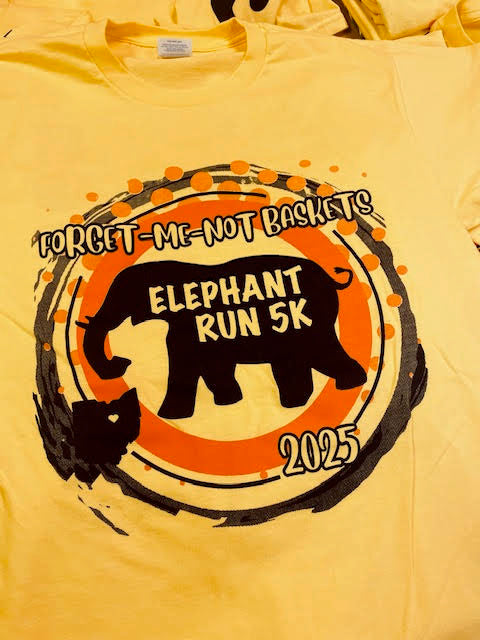 2025 Elephant Run Race T-Shirts with our Elephant Logo on the front, Race Sponsors listed on the back, in the color Yellow.